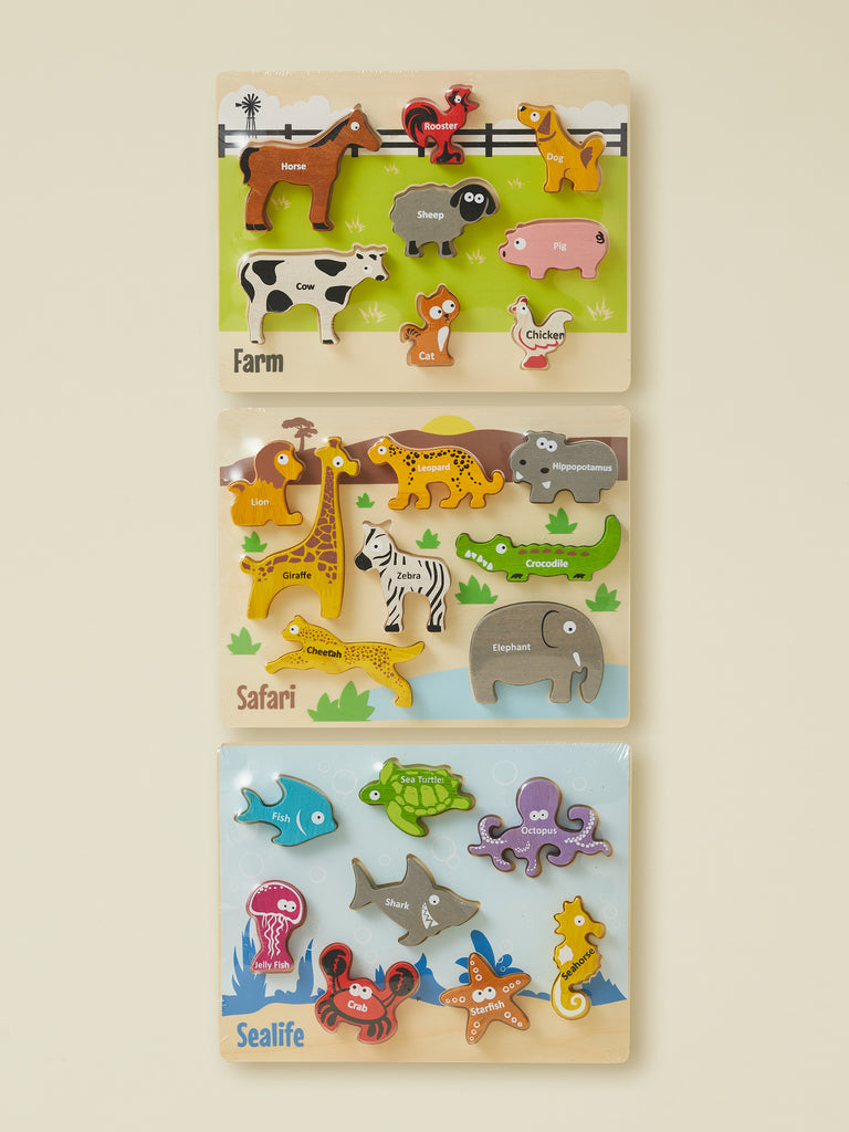 The BeginAgain Toys Animal Puzzles 3-Pack will help children practice fine motor skills, such as hand-eye coordination. It will also help to stimulate critical thinking and problem-solving as well as teach toddlers and preschoolers to match shapes. This first set of puzzles are perfect for the beginner! Each puzzles comes with chunky pieces and measures 9" x 6"!