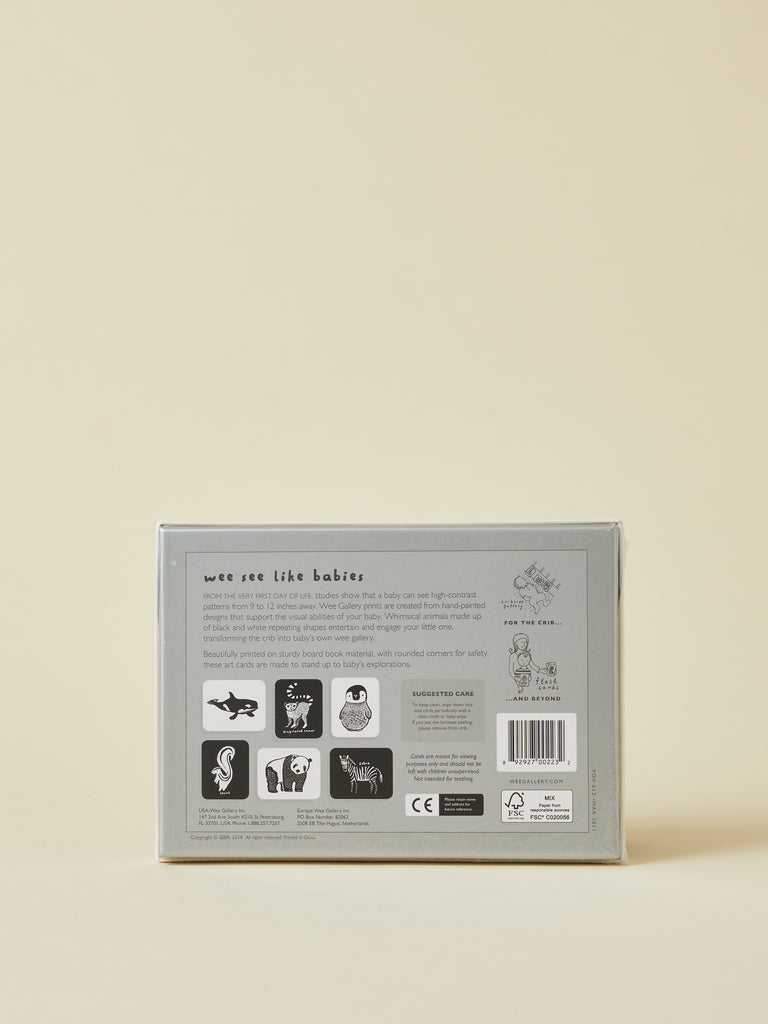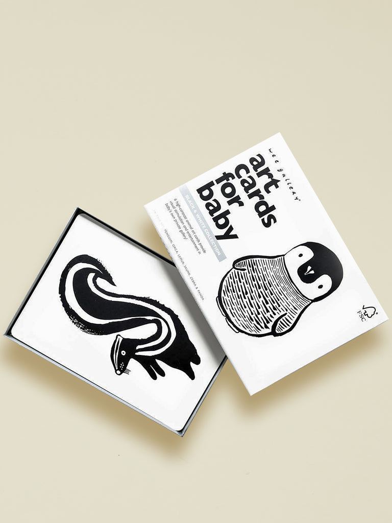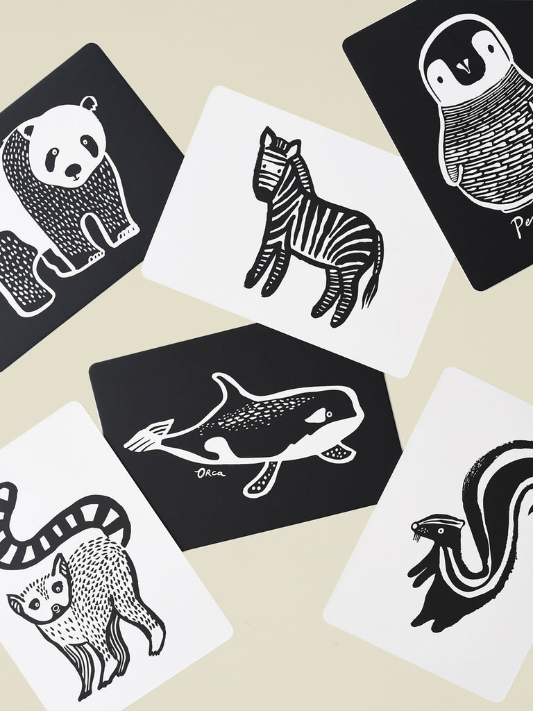 Black and white art cards for baby. Babies are fascinated with black-and-white designs. The six adorable animals in this set include a penguin, orca, lemur, skunk, panda, and zebra. Each 5" x 7" card is beautifully finished with matte lamination and child-friendly rounded corners.