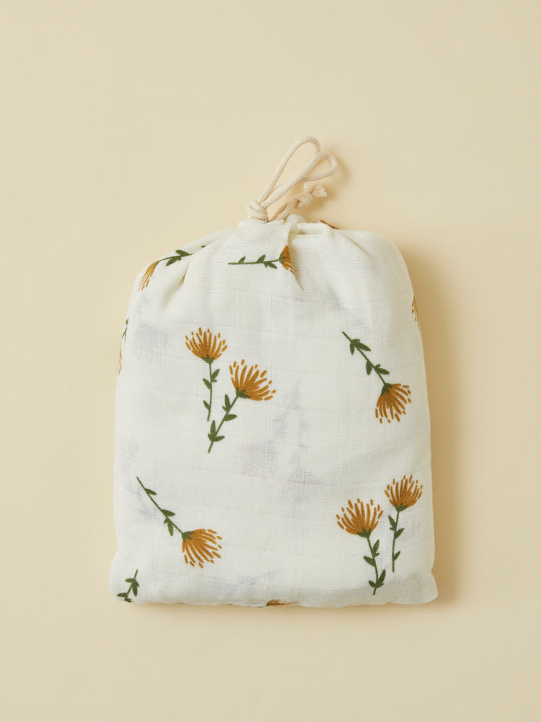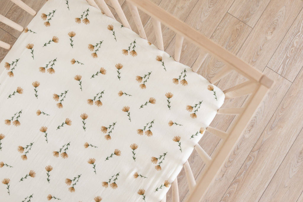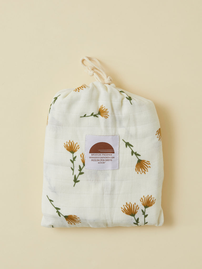 Part of our exclusive line of swaddles, sheets and quilts. Our Autumn crib sheets are printed on 100% muslin cotton.